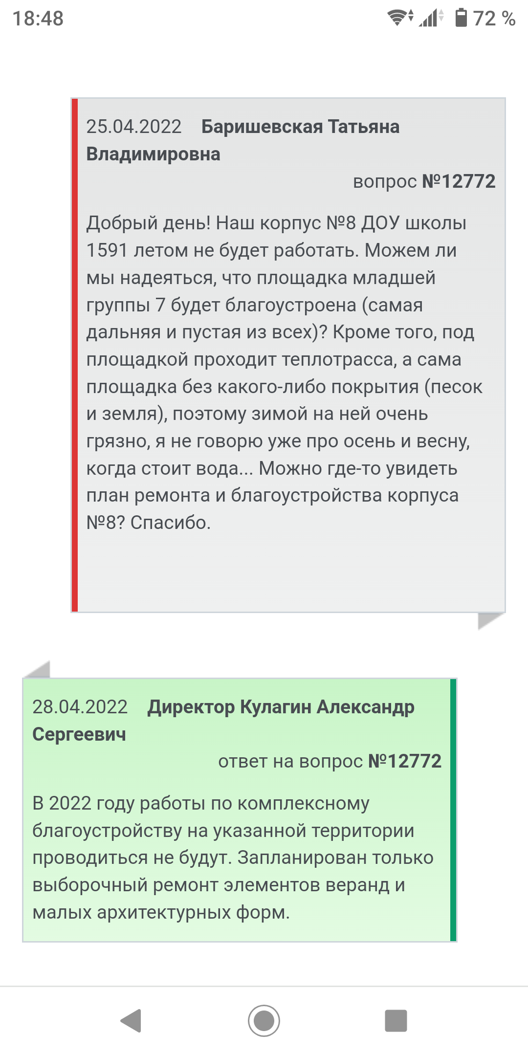 Заявка на проведение комплексного благоустройства школой направлена. До выполнения работ для прогулок группы будет подобрана другая площадка на территории, т.к. в следующем учебном году количество групп в здании уменьшится.